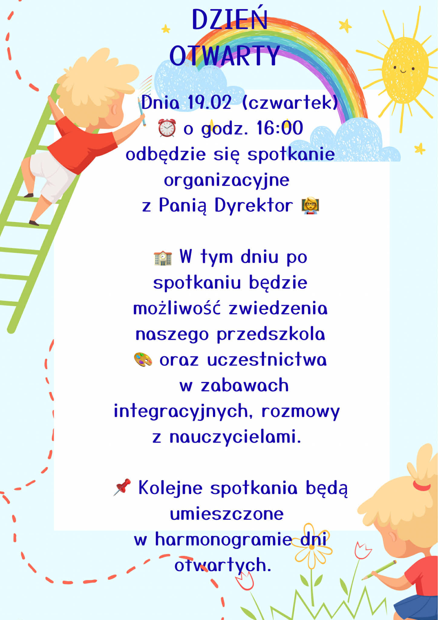 Ze względu na obostrzenia prosimy, aby do każdego dziecka przyszła jedna osoba.